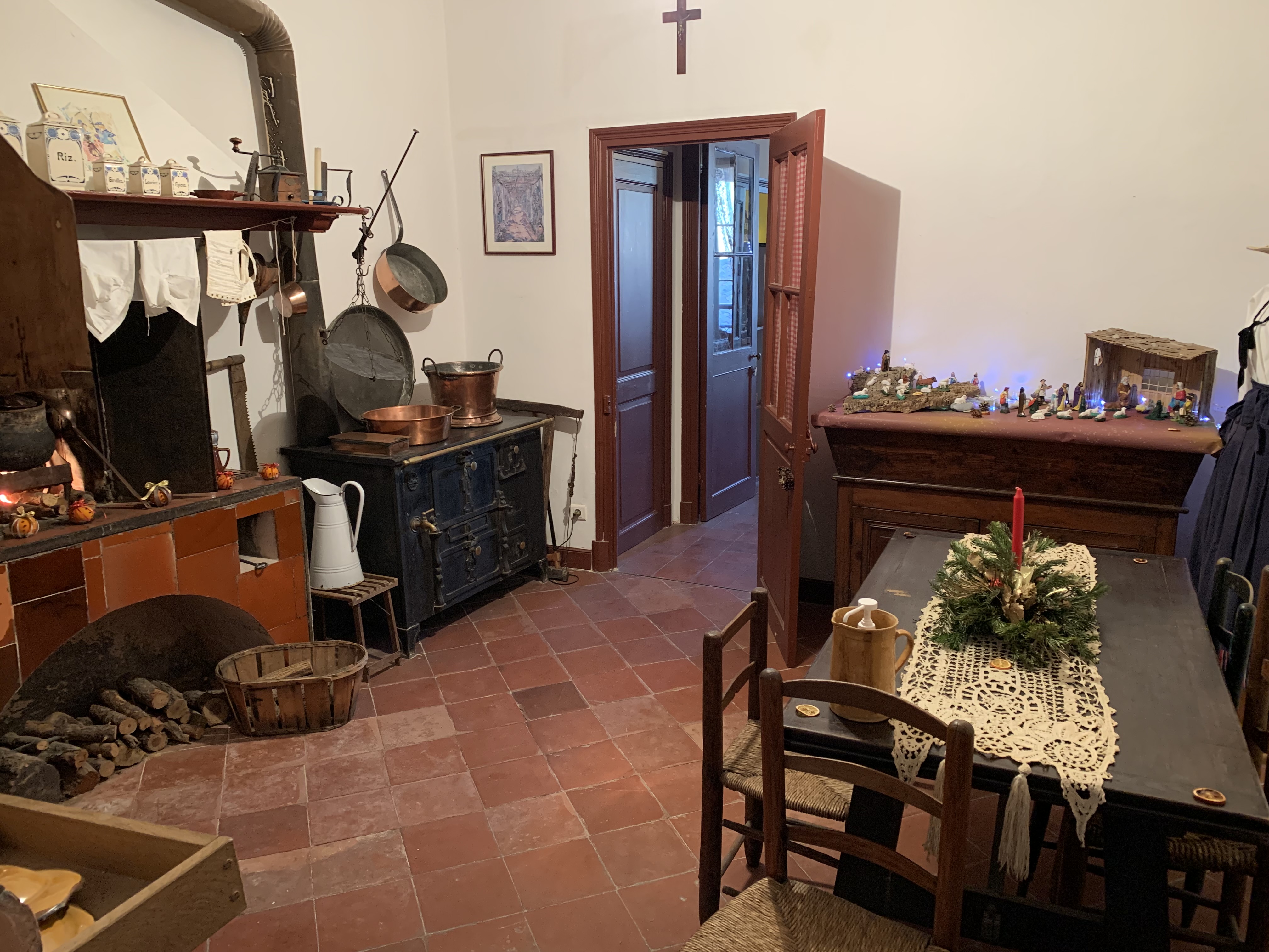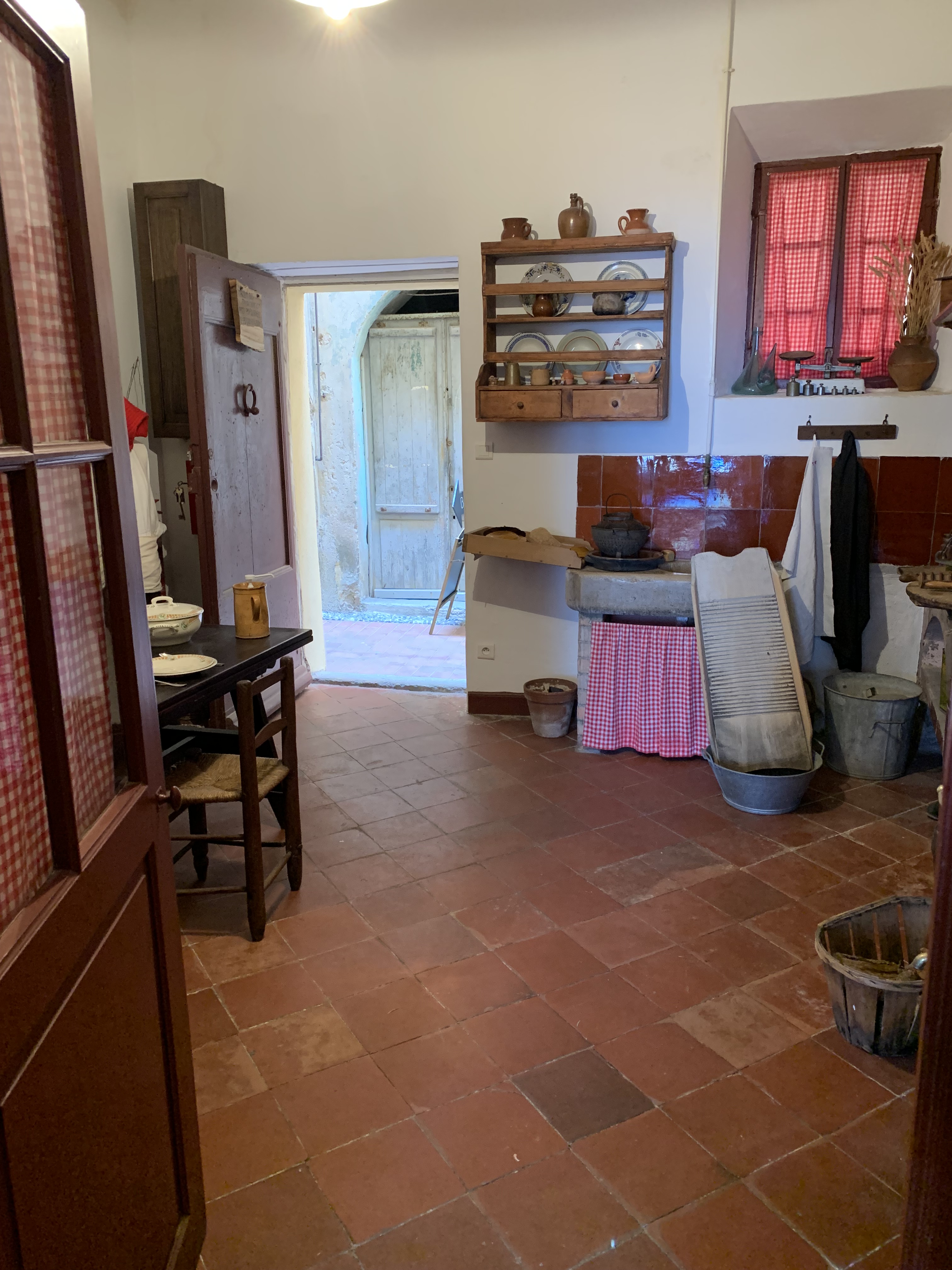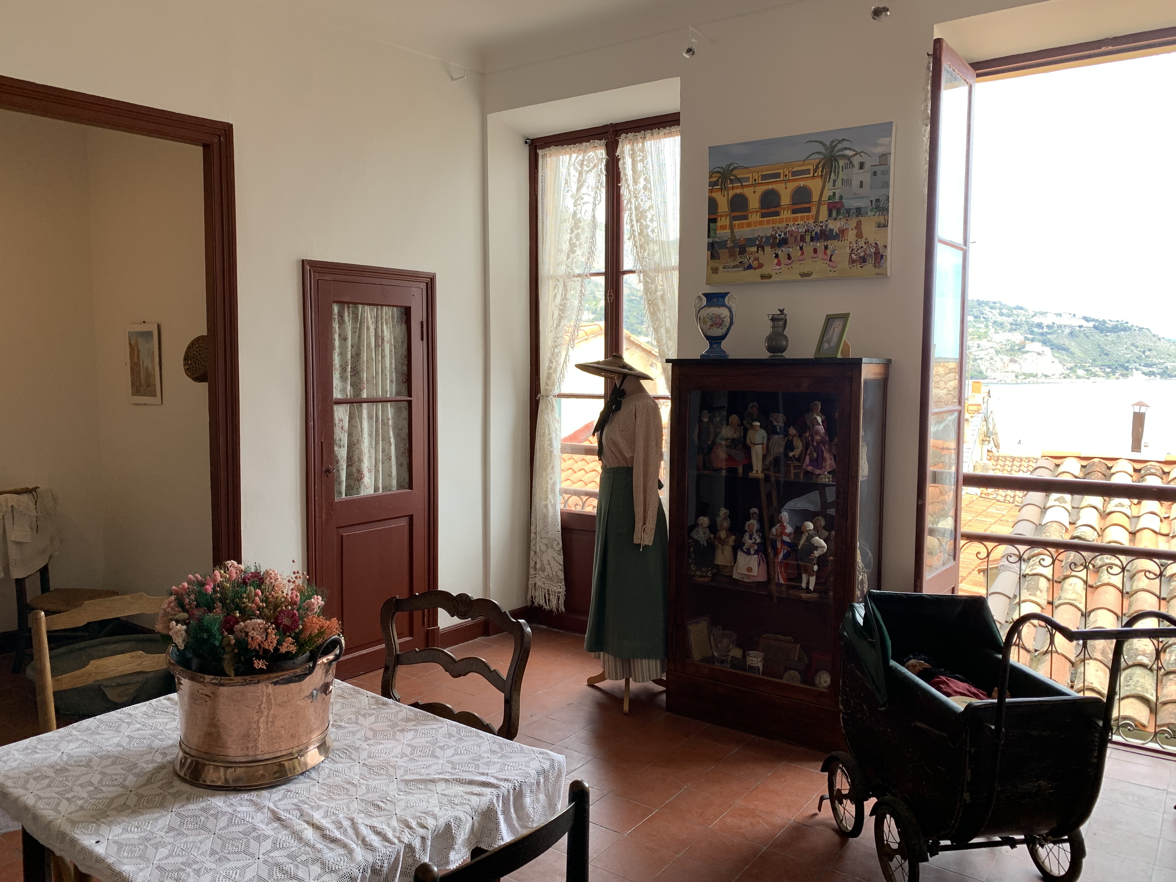 Cette maison est composée de 2 pièces, on y retrouve un mobilier simple (buffet avec pétrin, table, chaises, placards muraux), dans la cuisine un évier en grés, un potager en faïence marron… Le dallage au sol est d’origine et depuis la pièce principale, on découvre une vue magnifique sur les toits, la mer, le vieux port de Menton et l’Italie.