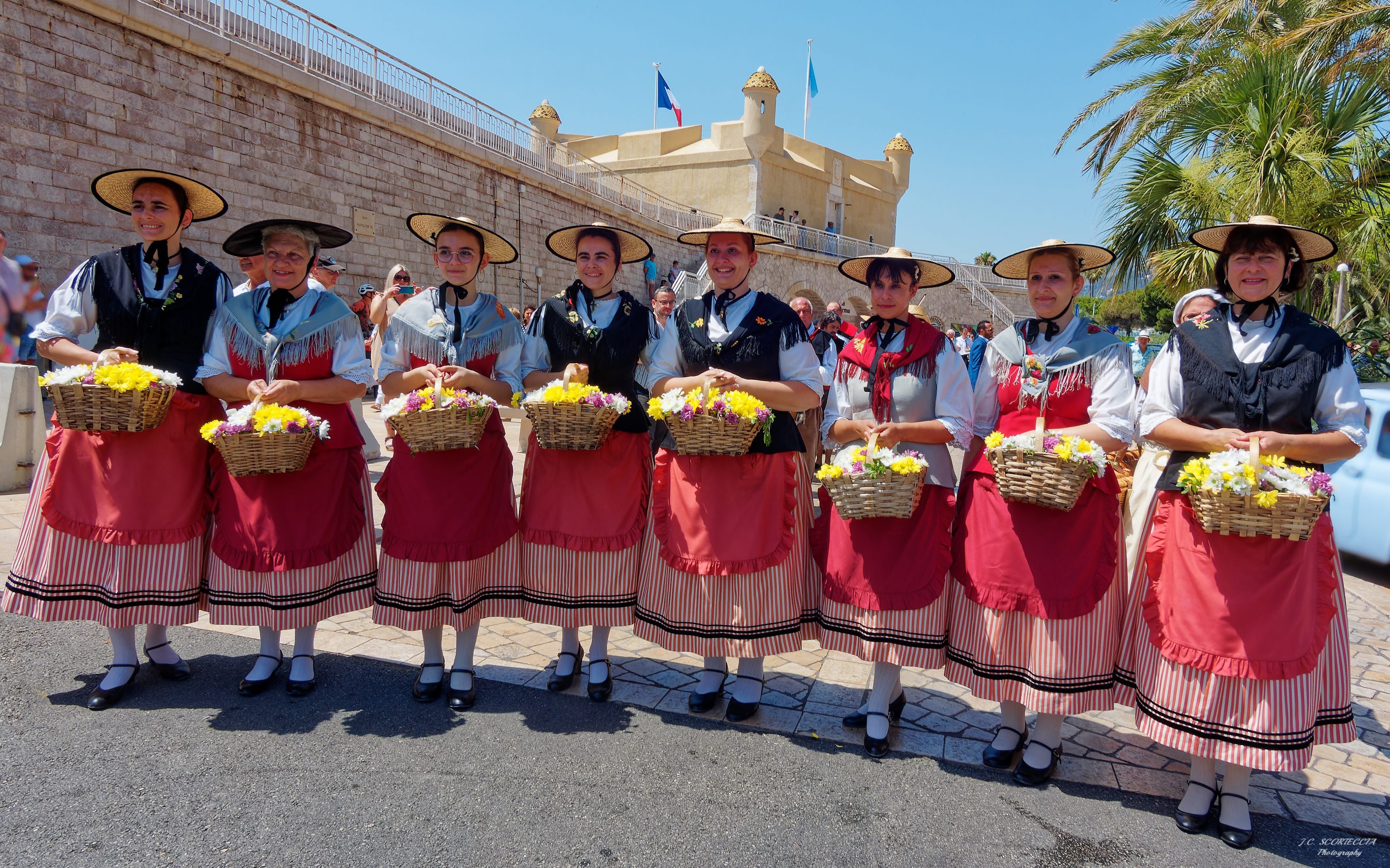 On les distingue par leurs jupes en soie sauvage, rappel du Prince Antoine 1er de Monaco qui avait fait planter 300 mûriers, pour offrir un essor économique à Menton. La jupe rayée rouge et blanc, aux couleurs des Grimaldi et ajusté de 3 galons de velours noir rappellent cette appartenance. Les bouquetières tirent leurs noms des petits bouquets de fleurs qu’elles vendaient aux riches estivantes.